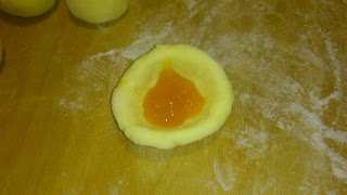 Impastate velocemente, ma con leggerezza, con l'uovo e il resto la farina. Prendete dei pezzetti di pasta grossi quanto una grossa noce e formare dei nidi all'interno dei quali poserete un cucchiaino di marmellata.